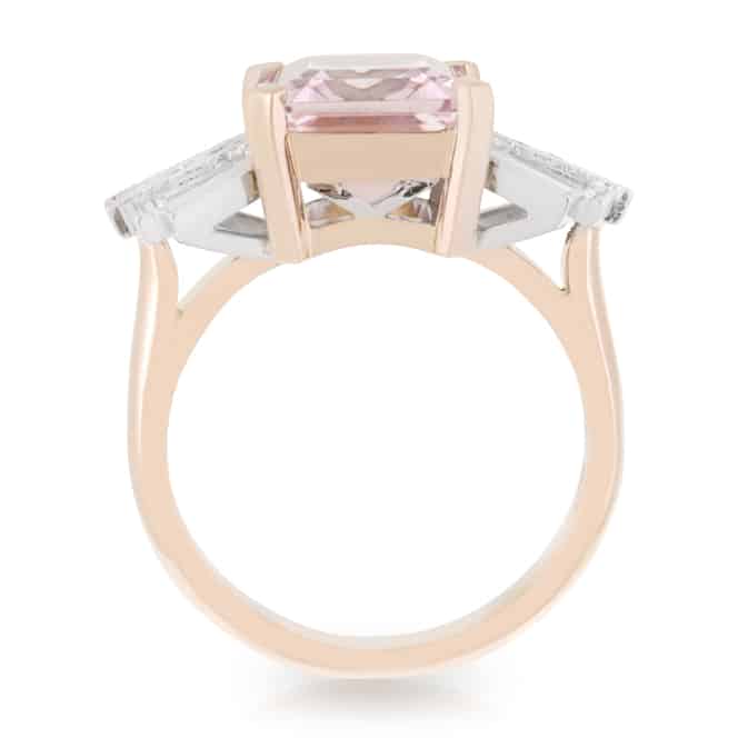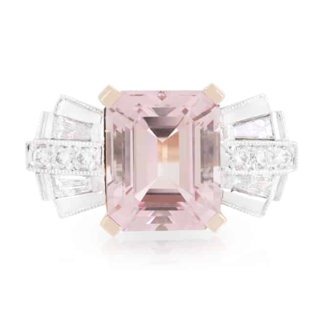 5.05ct Emerald cut Morganite and Art Deco Diamond Bow style Ring