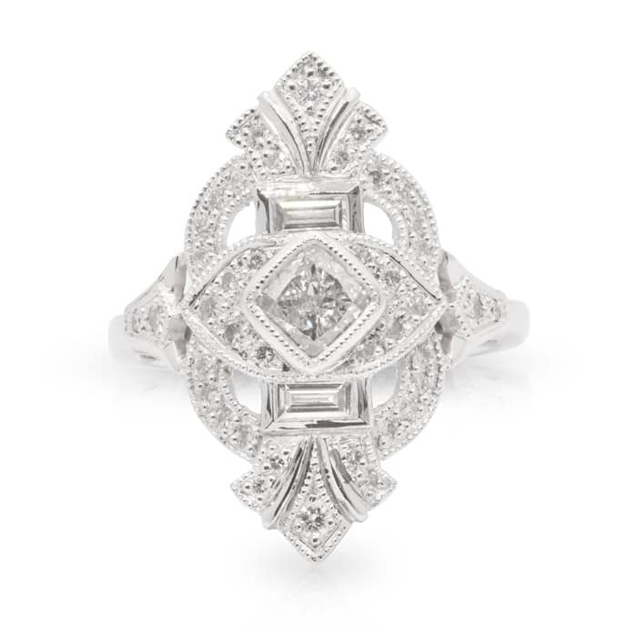 0.87ct Cushion cut H/Si2 Diamond with a surround of Baguette and Round brilliant cut diamonds