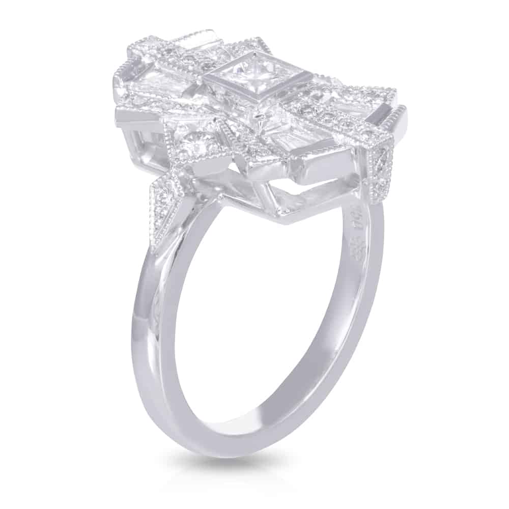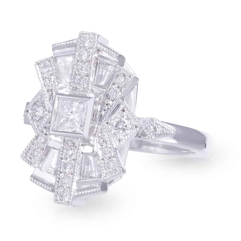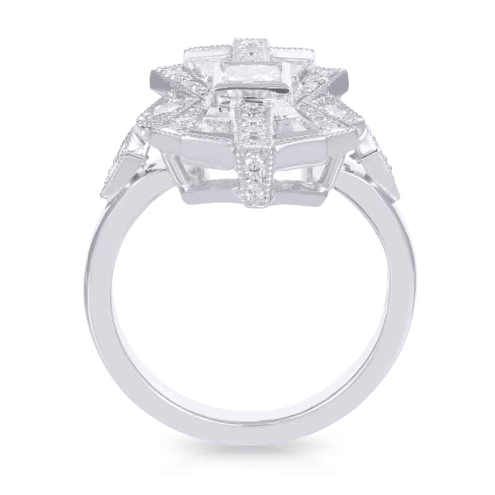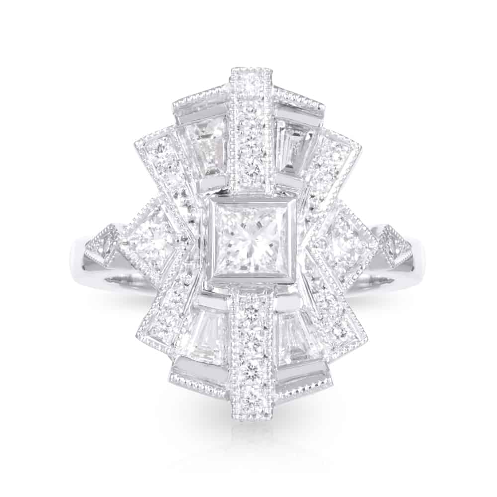 Diamond Sunrise Ring with 0.30ct Princess Cut Centre and Geometric Halo