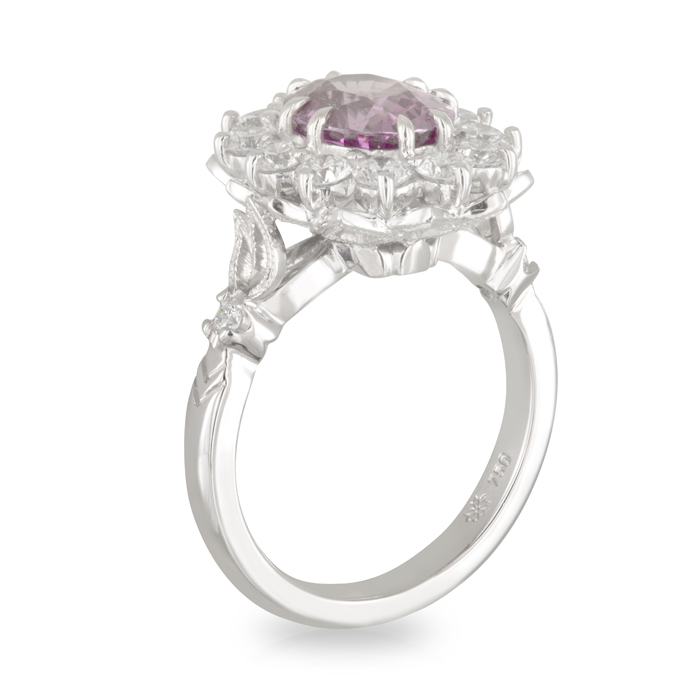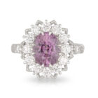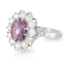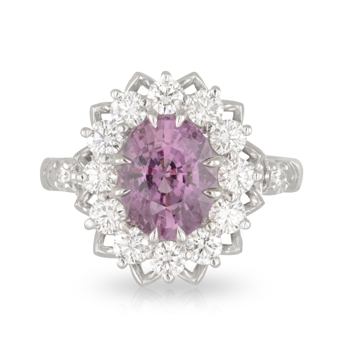 Oval 3.08ct Pink Ceylon Sapphire and Diamond Art Deco ‘Lotus’ Style Ring with intricate basket detail.