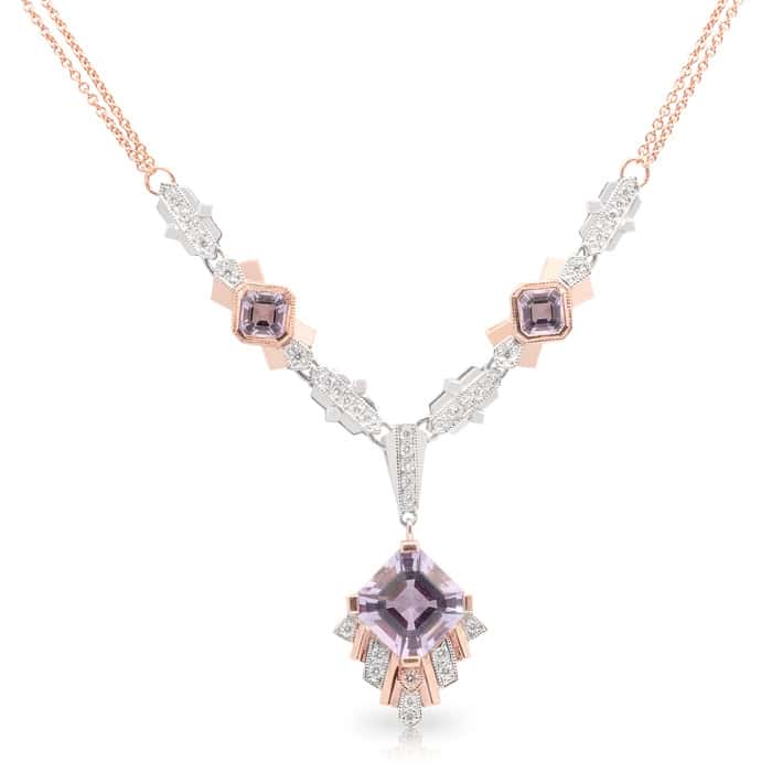 4.00ct Asscher cut Amethyst and Diamond Pendant with fixed Amethyst and Diamond Art Deco Link features on a Double Trace Link Design