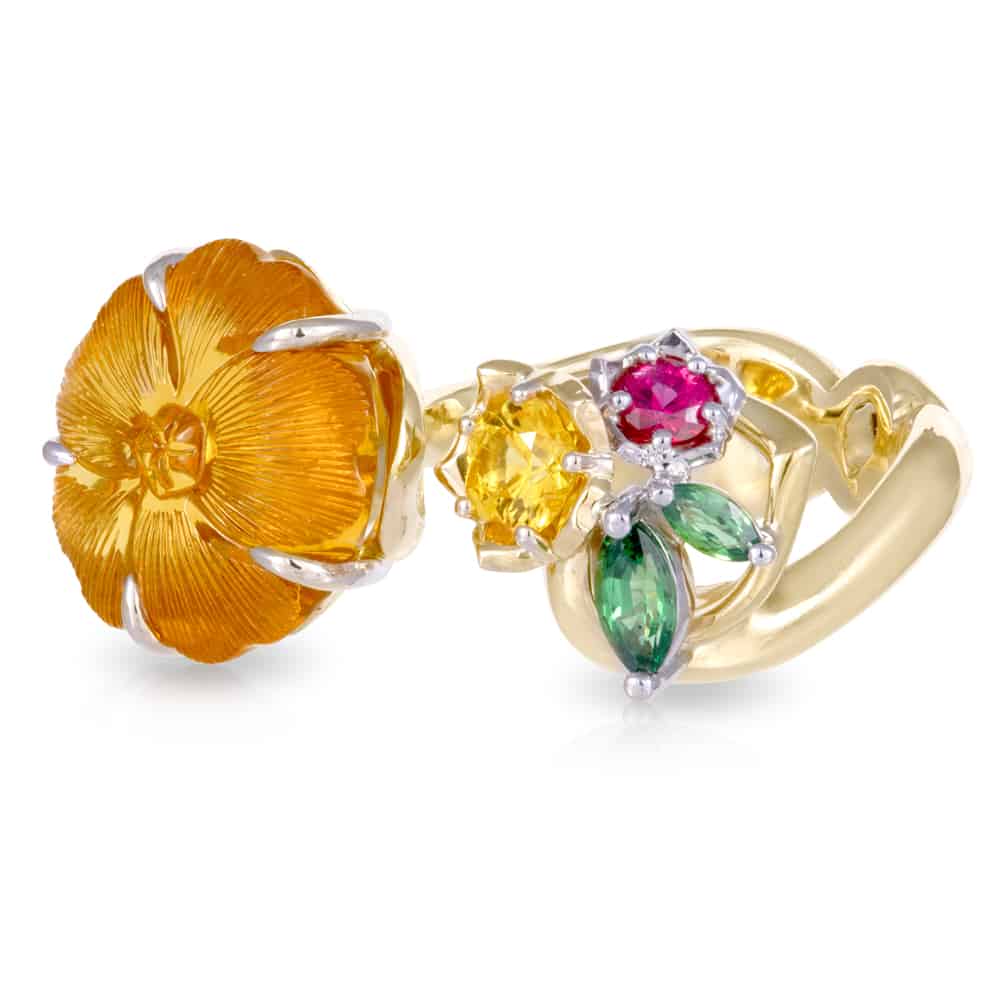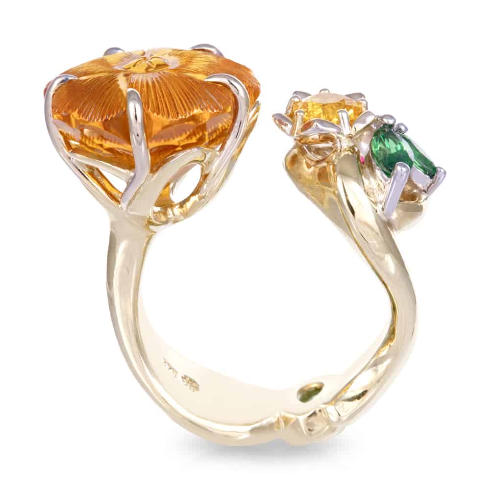 10.52ct Hand Carved Citrine Flower, Yellow Sapphire, Tsavorite Garnet and Red Spinel Dress Ring