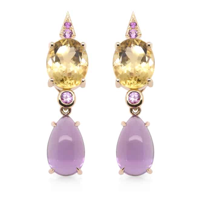 Transitional Yellow Beryl, Pink Sapphire and removable Amethyst Drop Earrings