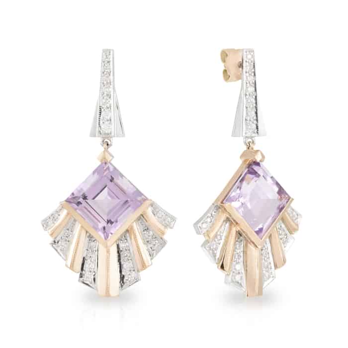 Carrae cut Amethyst Fan shaped drop earrings with Art Deco diamond feature