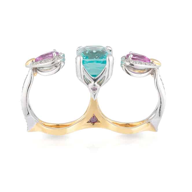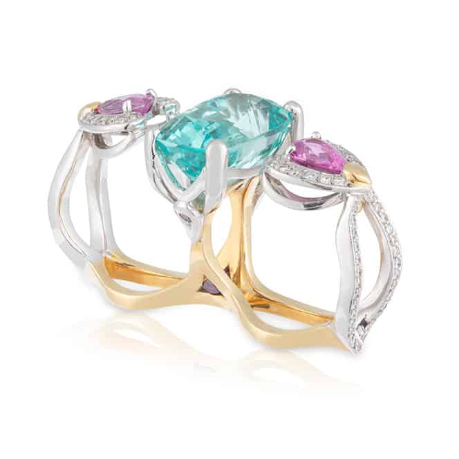 Double Finger 9.84ct Aquamarine, Pink Ceylon Sapphires & Diamond Dress Ring