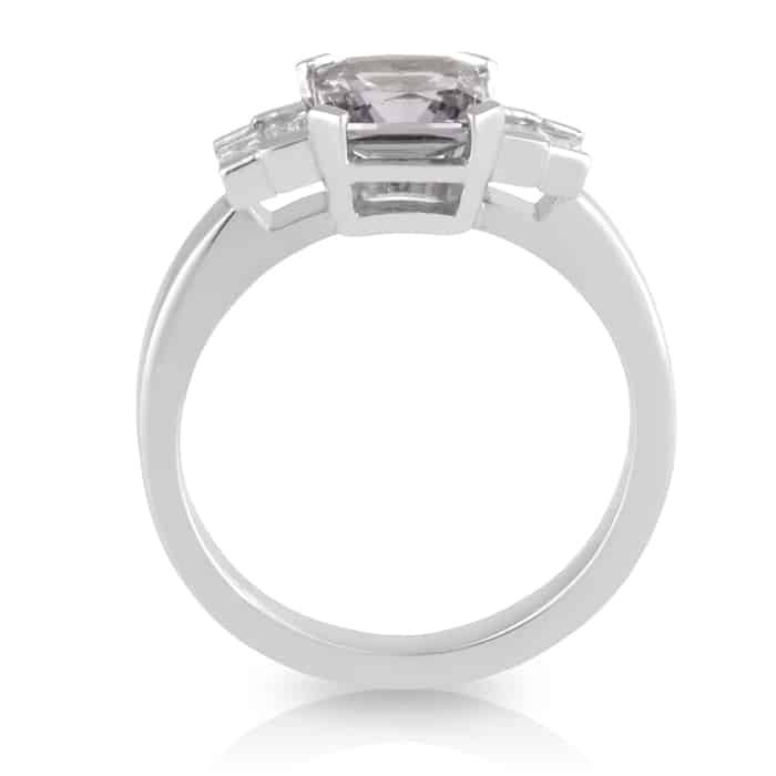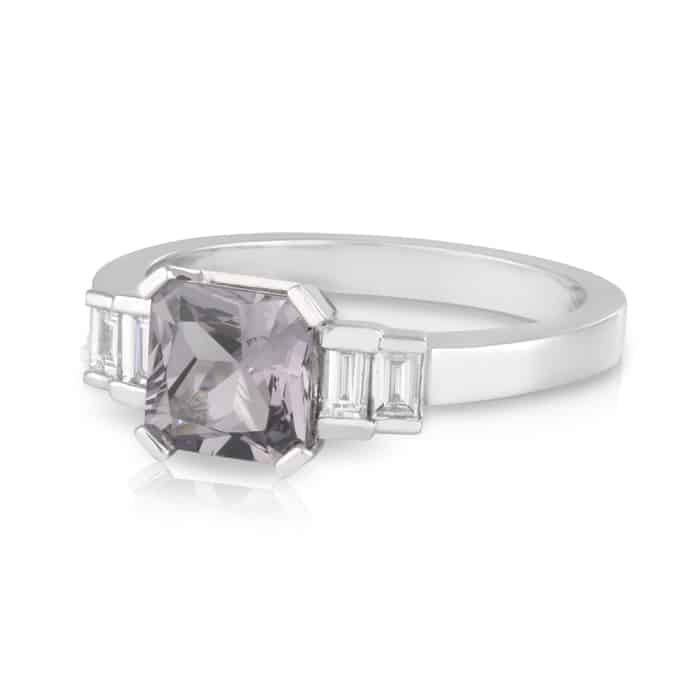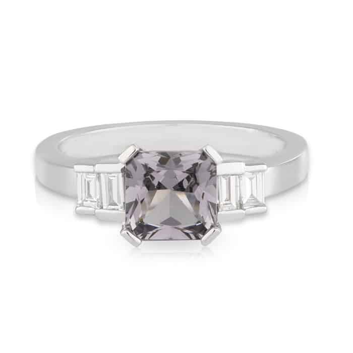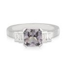Enquire Now18t White Gold Asshcer Cut 1.80ct Mauve/Grey Spinel with Baguette Diamonds Shoulders Engagement Ring.