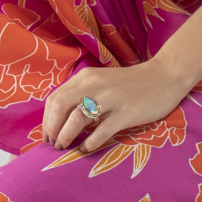 11.23ct Boulder Opal with Tsavorite Garnets, Red Spinel, Purple Sapphire & Diamond Dress Ring