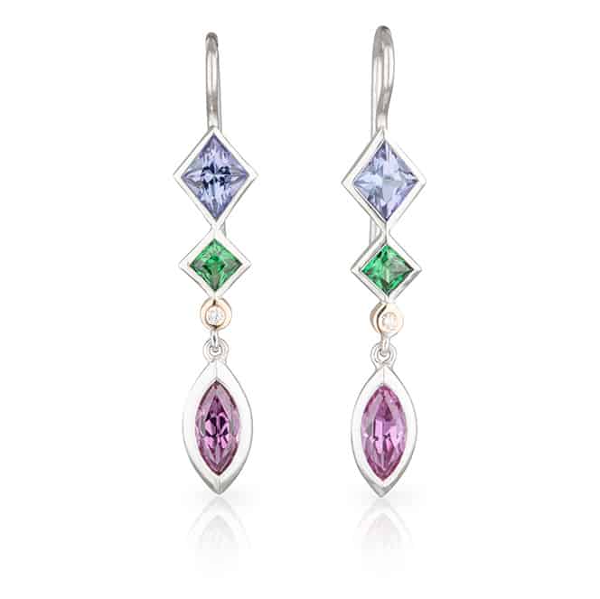Tanzanite, Tsavorite Garnet and Pink Sapphire Drop Earrings