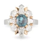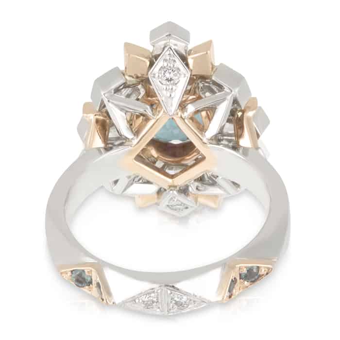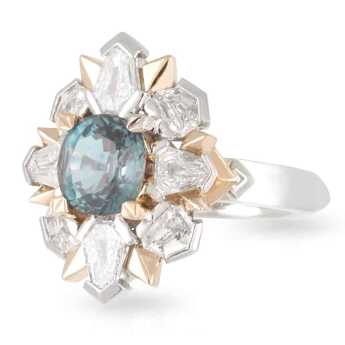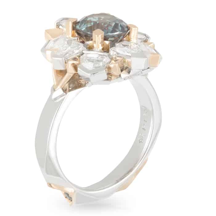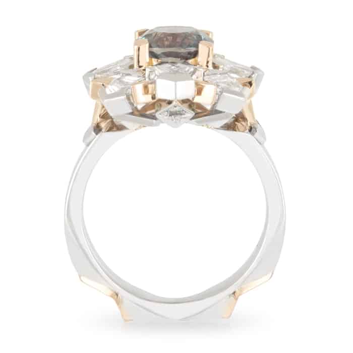 2.28ct Cushion Cut Colour Change Alexandrite & Geometric Diamond Halo Ring.