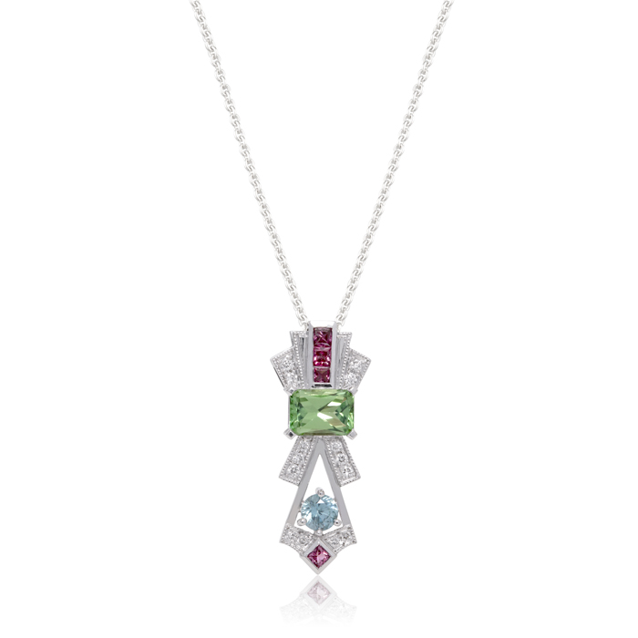 Pink Spinel, Green Tourmaline, Blue Zircon and Diamonds